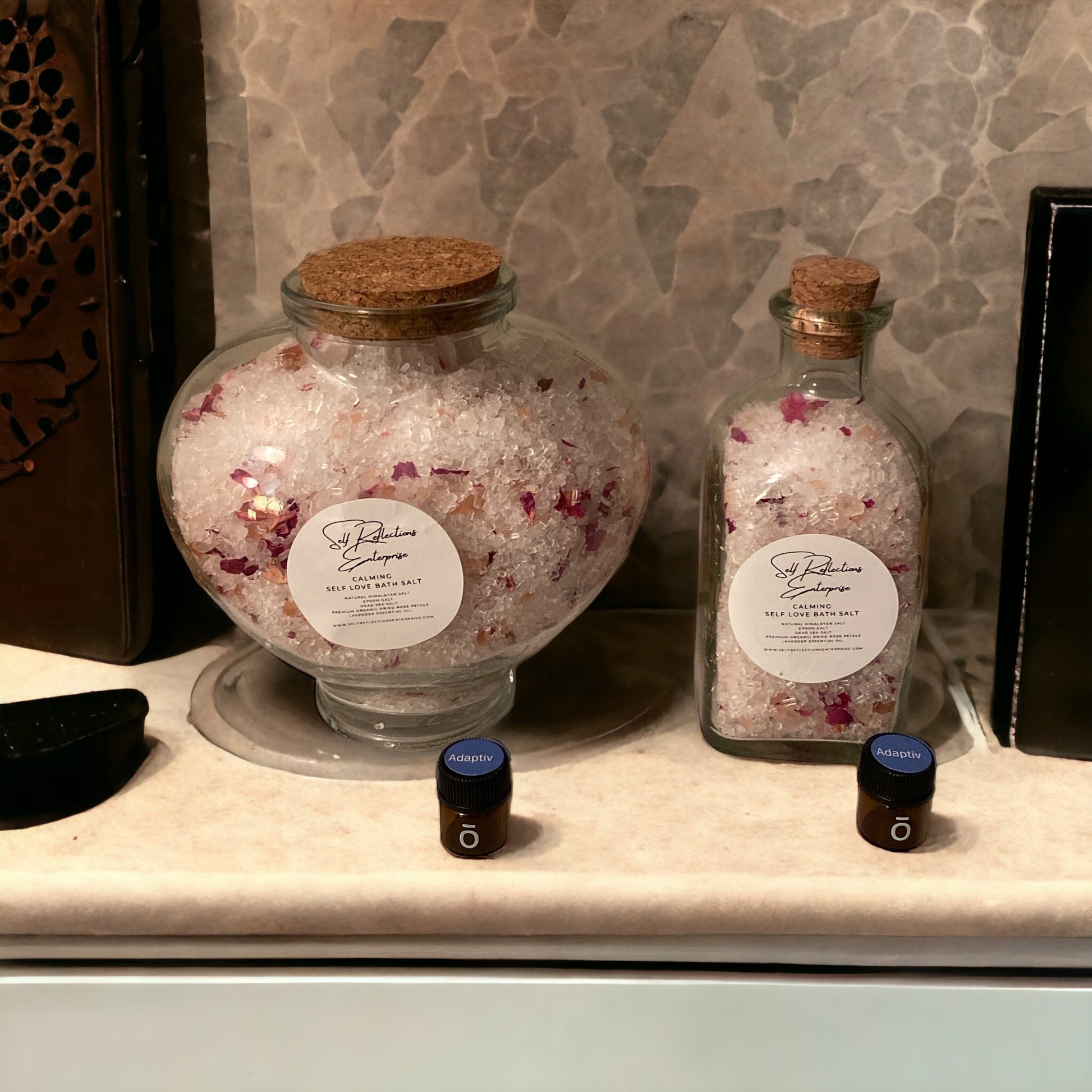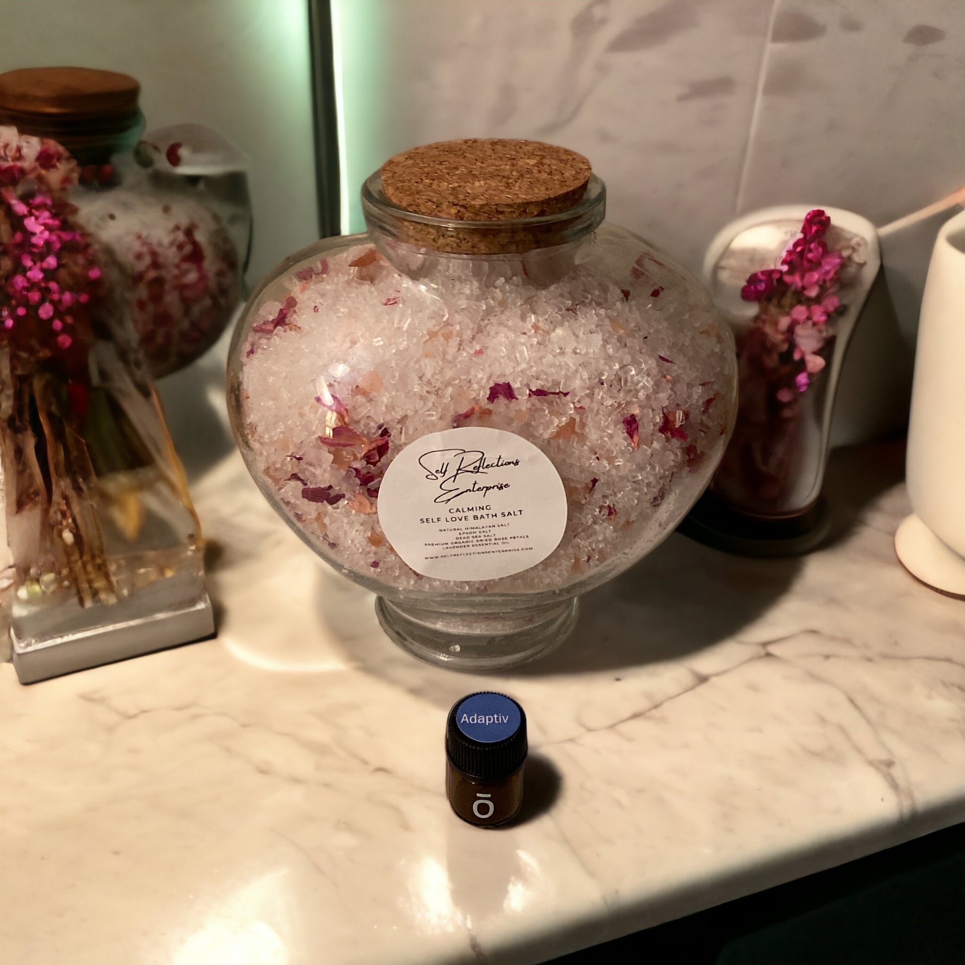 Materials: Natural Himalayan Salt, Epsom Salt, Dead Sea Salt, Premium Organic Dried Rose Petals, Adaptiv Essential Oil On The Side, 12oz Glass Dishwasher Safe Jar
