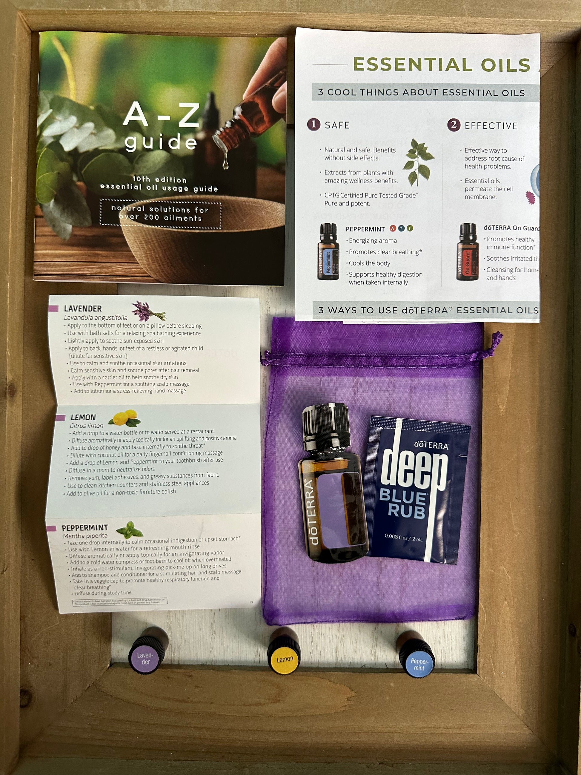 The essential oil sample bag will include a sample of Lavender, Lemon, and Peppermint. It will also include a sample of the month. This sample will be one of my current favorite essential oils. There will be a sample of Deep Blue as well, a description of each oil and an essential oil made simple guide.