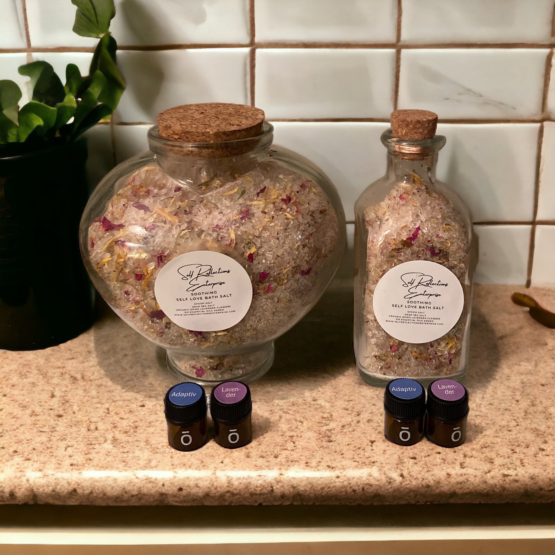 Our Soothing Self Love bath salt is a perfect blend of our Calming & Healing bath salts. The highlighted ingredients are premium organic dried rose petals and organic calendula flowers. Adaptiv and Lavender essential oils on the side. Adaptiv is a calming blend. Enjoy a peaceful aroma while you relax. Lavender is known for improving sleep as well as decrease anxiety. Take a moment to destress.